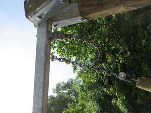 Spannender wird es im nächsten Bild. Hier wurde die Tragkette mit der Sicherungskette verwechselt. Das ist nur durch Nichtfachleute denkbar. Denn eine Tragkette muss an einer ordentlichen verschleißarmen Lagerung aufgehängt sein. Die ist leicht zu erkennen. Bei der Sicherungskette wird sparsamer konstruiert, da reicht eine Reiblagerung zwischen Metall und Metall. Natürlich hält dieses, da ja die Sicherungskette im Notfall das gesamte Gewicht übernehmen muss. Allerdings ergibt sich ein kräftiger Metallabrieb bei ständiger Benutzung. Bei hoher Nutzung in einem Kindergarten reicht aber auch dann das Zeitinterfall zwischen zwei Jahreshauptinspektionen, um größeren Schaden zu verhindern. Das lehrt die Erfahrung.