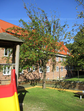 Dieser Spielplatz gehört zu einer Kita in Travemünde. Mehrere sehr schöne ältere Obstbäume sind vorhanden, haben viele Früchte Ende August 2024 getragen.